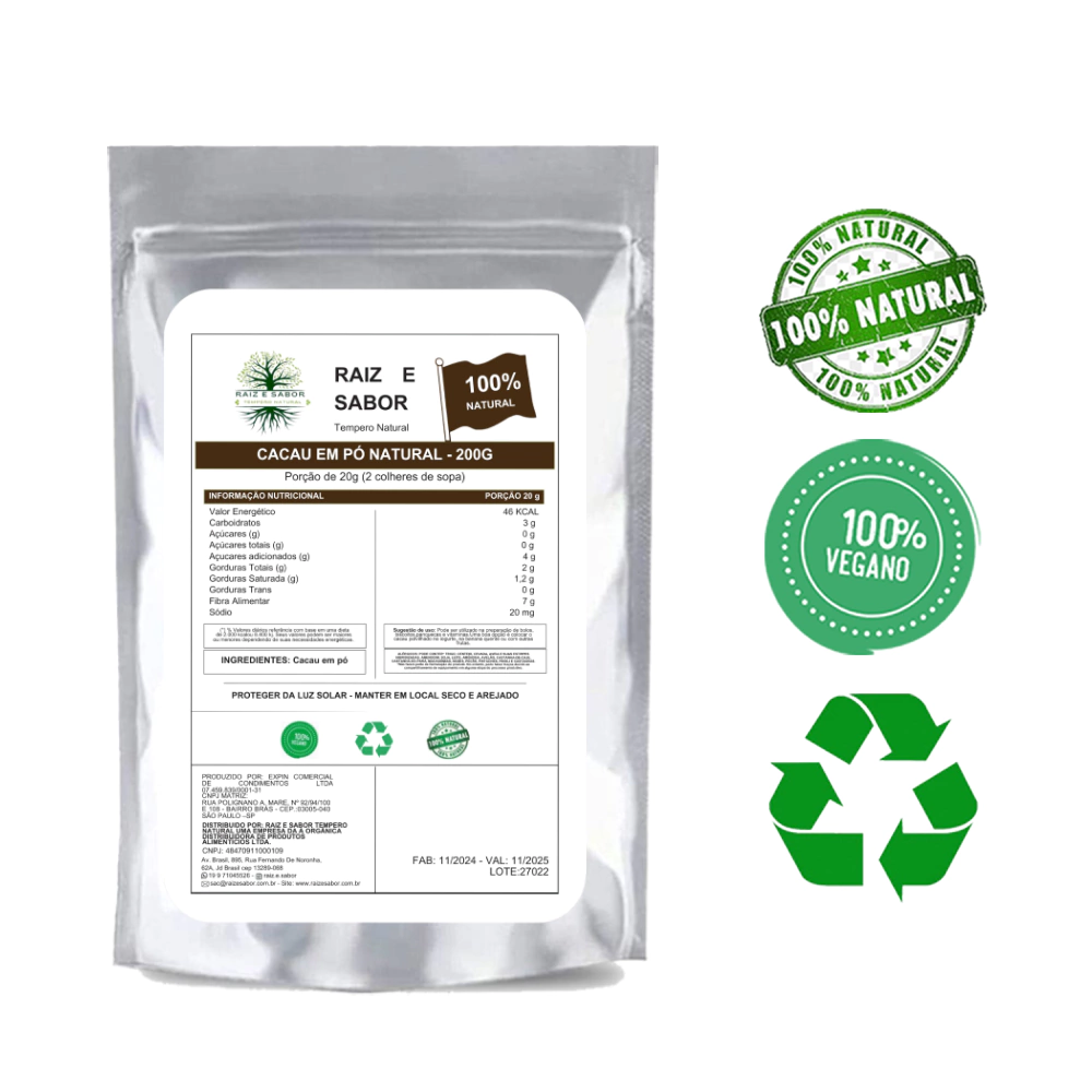 Dica de uso: Para uma bebida nutritiva, misture 1 colher de cacau em pó com leite (ou leite vegetal) e um pouco de mel ou adoçante. Também é perfeito para enriquecer receitas doces e até mesmo para criar opções saudáveis de chocolate quente!