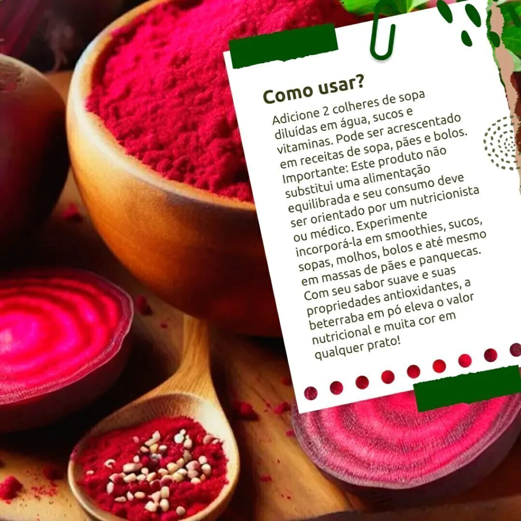 A farinha de beterraba é uma opção saudável e rica em antioxidantes, fibras e nutrientes essenciais. Com seu sabor levemente adocicado e sua cor vibrante, é ideal para enriquecer receitas de bolos, pães, panquecas e smoothies, adicionando um toque nutritivo e colorido. Além de promover a saúde cardiovascular e melhorar a digestão, a farinha de beterraba é uma excelente forma de incorporar mais vegetais na sua alimentação diária.